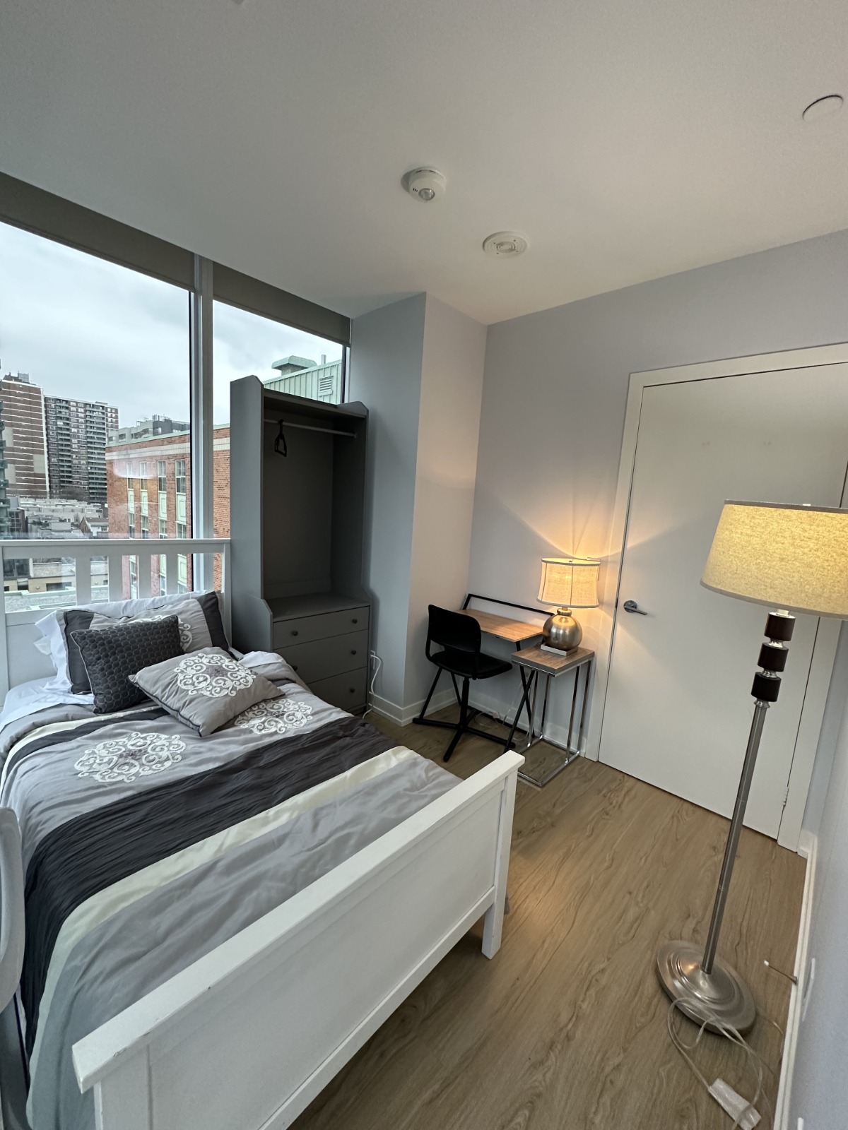 Experience the charm of downtown Toronto in this spacious deluxe room located at Wood & Church St. This room features a comfortable double bed, a work-friendly space, and a large balcony overlooking a vibrant city park. Enjoy the beautifully designed common areas including a chic living space, a fully equipped modern kitchen, and a luxurious bathroom. Perfect for those who value comfort and accessibility in the city's heart.
